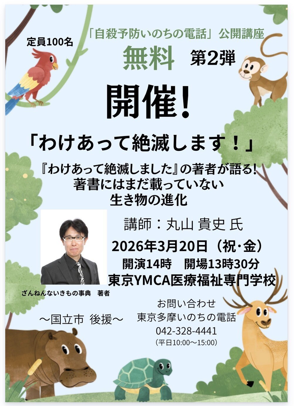 「ざんねんな生き物事典」「わけあって絶滅しました」などを書かれた丸山貴史さんによる、著書にはまだ載っていない生き物の進化についてのわかりやすい講演会です。