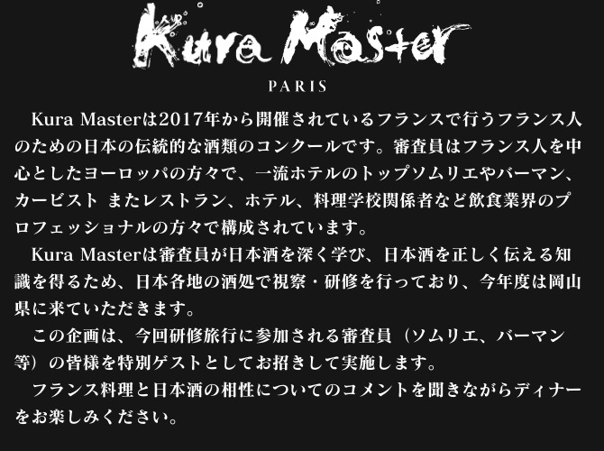 ・Kura Masterは2017年から開催されているフランスで行うフランス人のための日本の伝統的な酒類のコンクールです。審査員はフランス人を中心としたヨーロッパの方々で、一流ホテルのトップソムリエやバーマン、カービスト またレストラン、ホテル、料理学校関係者など飲食業界のプロフェッショナルの方々で構成されています。
