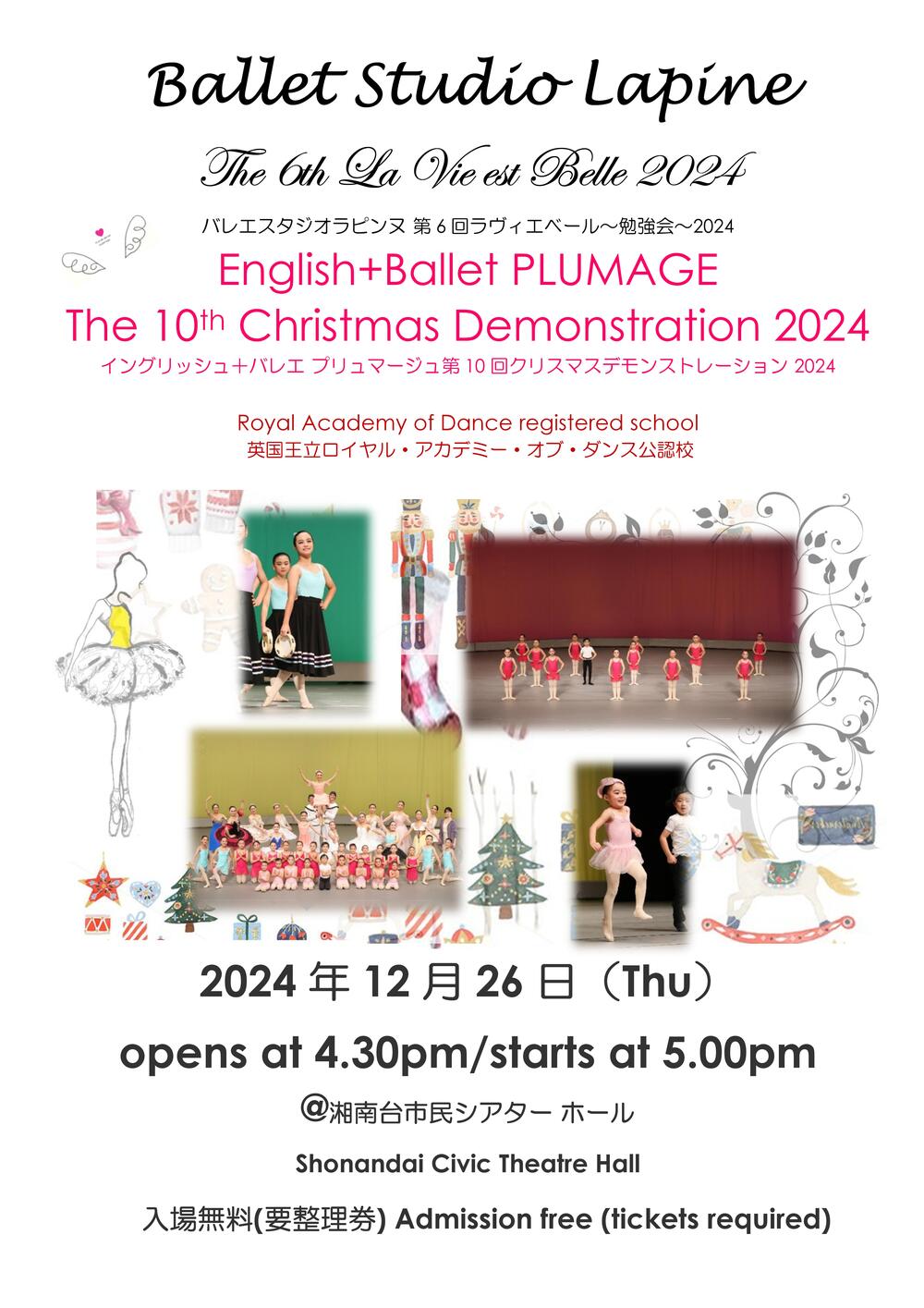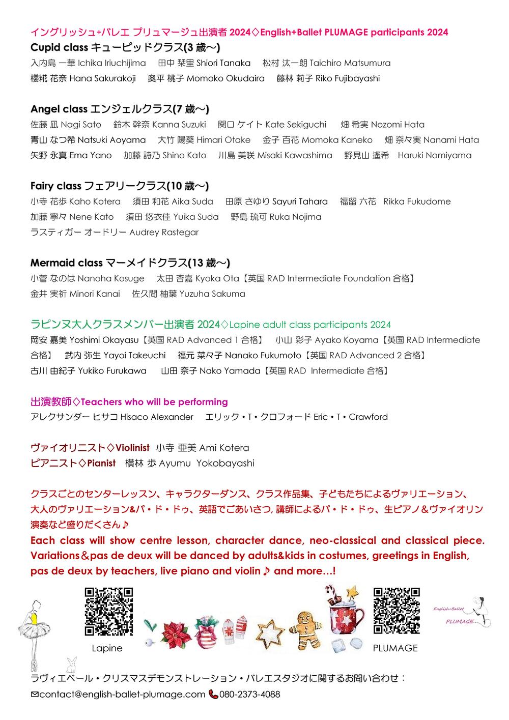 Variations &pas de deux will be danced by adults&kids in costumes, greetings in English, pas de deux by teachers, live piano and violin & and more...!