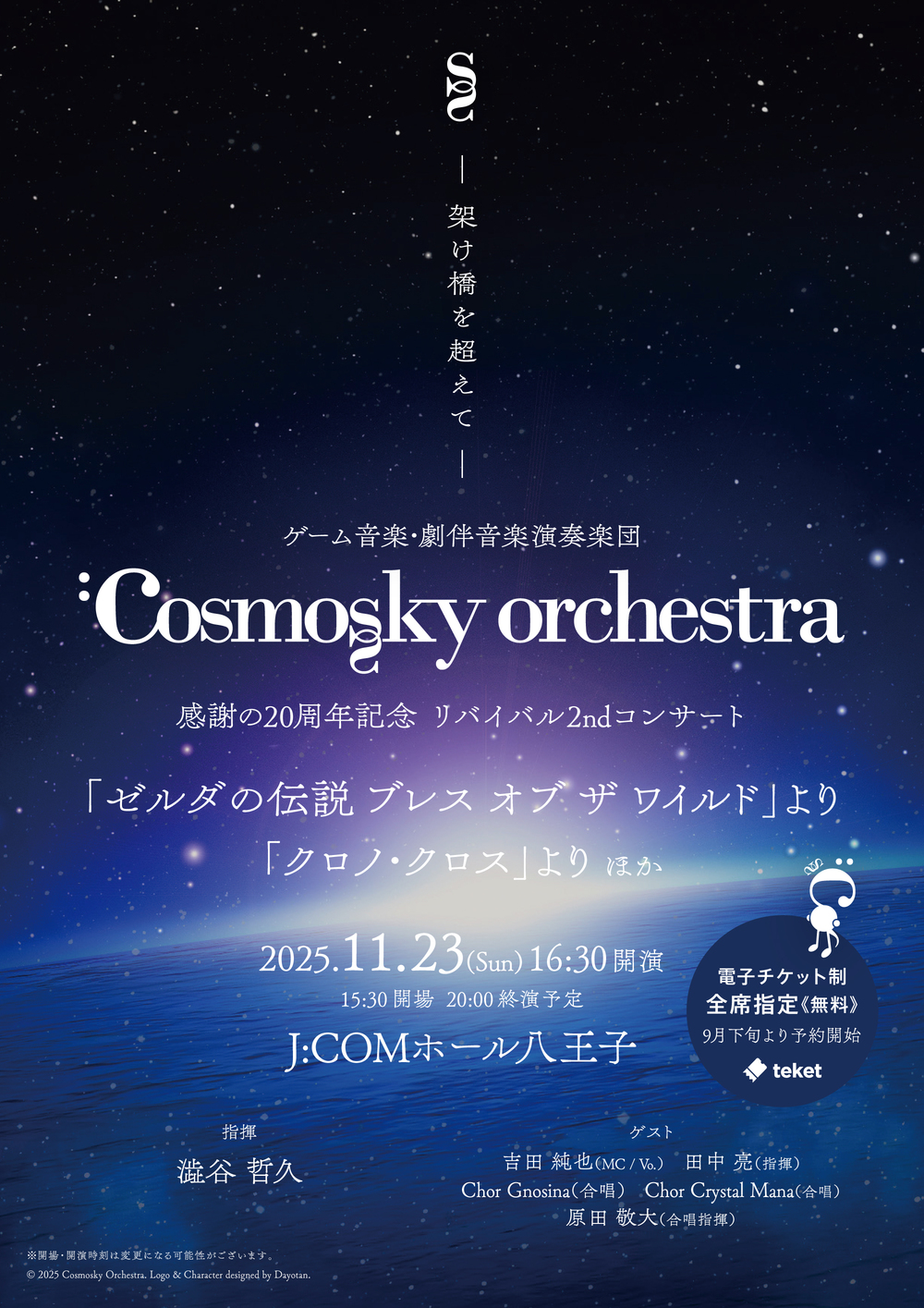 コスモスカイオーケストラは、ゲーム、映画、TVドラマなどの劇伴音楽(実用音楽)を演奏する楽団。2005年に発足、今年で創立20周年を迎える。クラシックオーケストラ編成を母体にエレキギターやドラムなどの楽器に加え、自由な編成による自由な音楽の実現を目指して、都内近郊で活動中。過去の演奏会では、Chor Crystal Mana、東京滝野川少年少女合唱団、Chor Gnosina、ファミ箏とのコラボレーションや、作曲家の光田康典氏、岩垂徳行氏、なるけみちこ氏らの名だたるアーティストとの共演を果たしている。また、HoYoverse主催の「崩壊:スターレイル」クリエイターコンテストにて、演奏動画が2023年8月に優秀賞、2025年7月に三等賞・人気賞を受賞した。