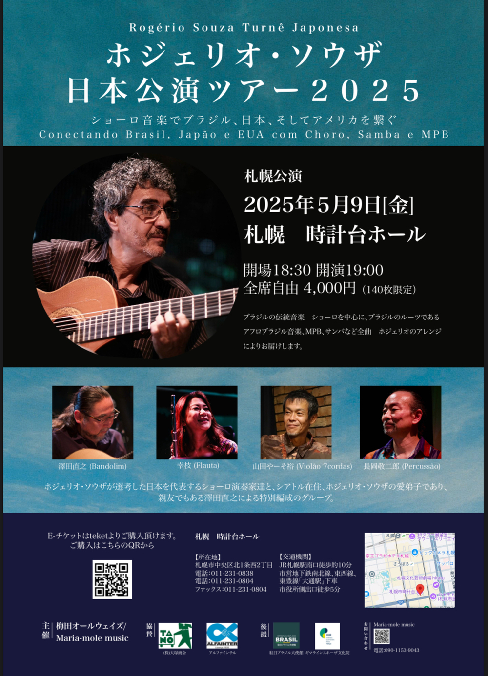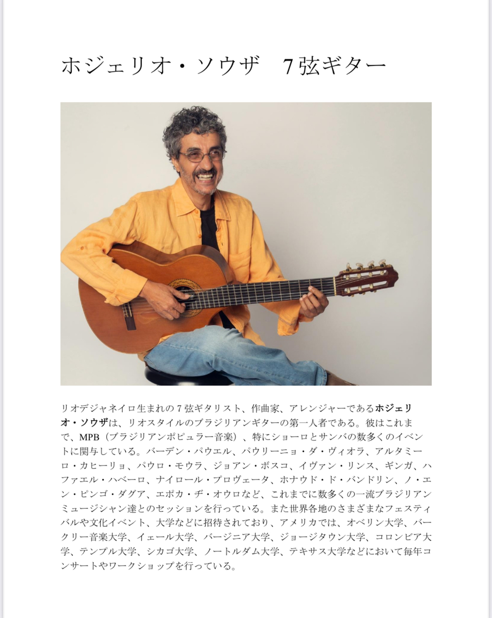 ブラジルの伝統音楽 ショーロを中心に、ブラジルのルーツであるアフロブラジル音楽、MPB、サンバなど全曲 ホジェリオのアレンジによりお届け致します。