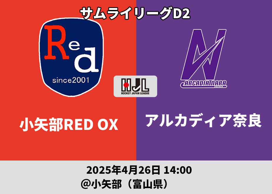 サムライD2#3 小矢部RED OX vs アルカディア奈良 4/26(土)小矢部ホッケーフィールドby三井アウトレットパーク(富山)