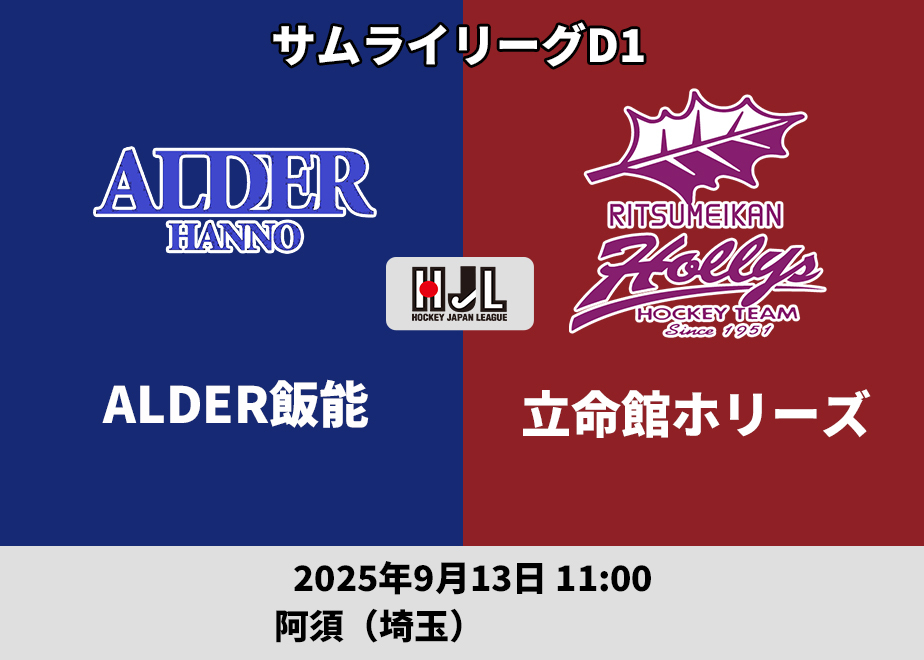 サムライD1#30 ALDER飯能 vs 立命館ホリーズ 9/13(土)阿須運動公園ホッケー場(埼玉・飯能市)