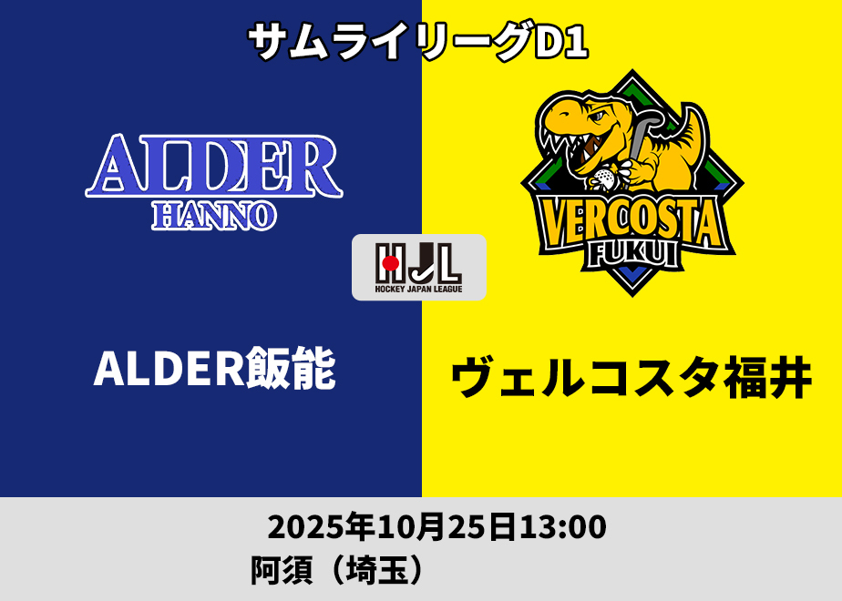 サムライD1#50 ALDER飯能 vs ヴェルコスタ福井 10/25(土)阿須運動公園ホッケー場(埼玉)