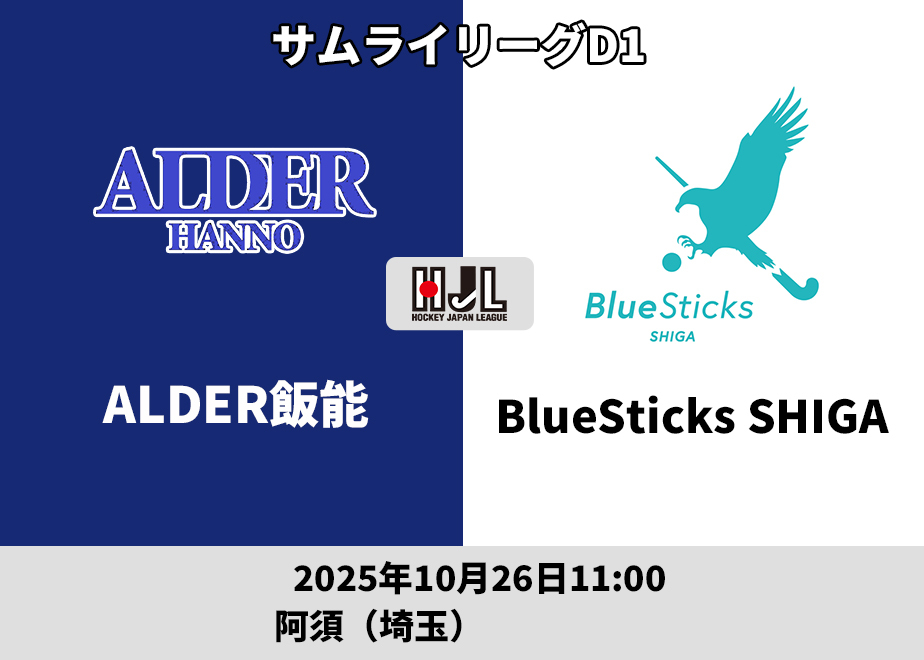 サムライD1#51 ALDER飯能 vs blueSticksSHIGA 10/26(日)阿須運動公園ホッケー場(埼玉)