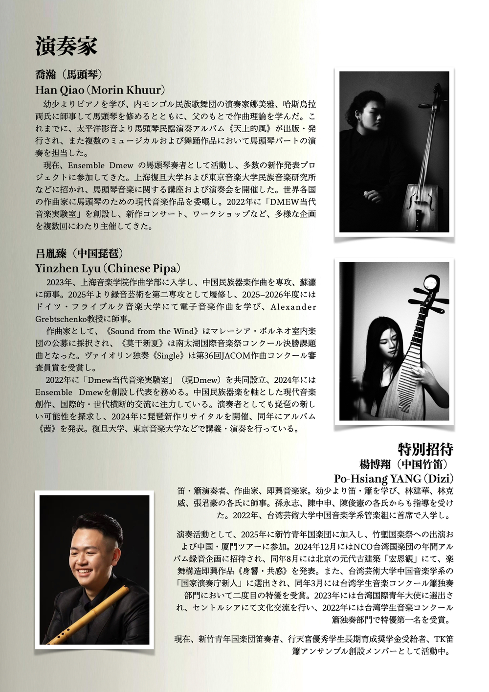 日本、中国本土、香港、台湾、そしてマレーシアの作曲家たちが、Ensemble Dmewの演奏家とともに、伝統弦楽器の新たな表現の可能性を探求する。