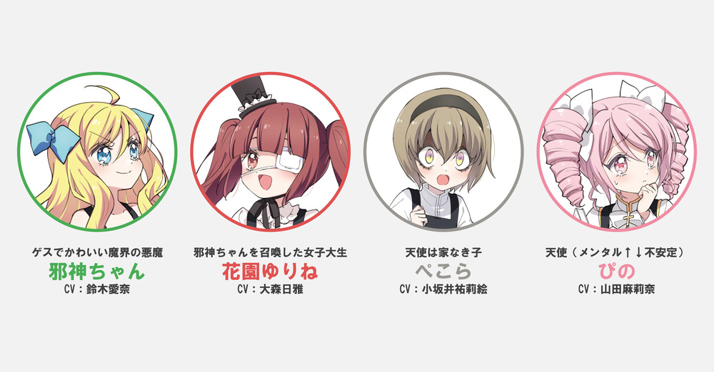 邪神ちゃん(CV:鈴木愛奈)、花園ゆりね(CV:大森日雅)、ぺこら(CV:小坂井祐莉絵)、ぴの(CV:山田麻莉奈)