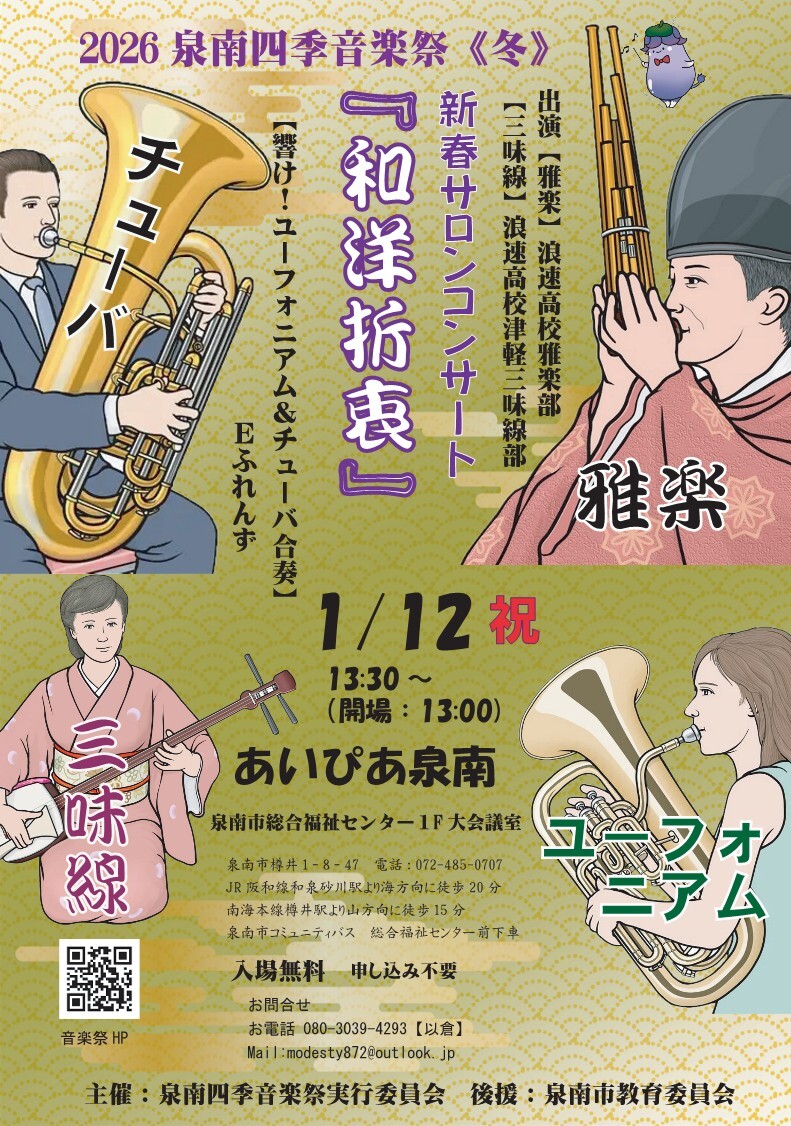 雅楽『越天楽』 津軽三味線『六段』『千本桜』 ユーフォニアム&チューバ合奏『アイネクライネナハトムジーク』『冬のソナタ』他