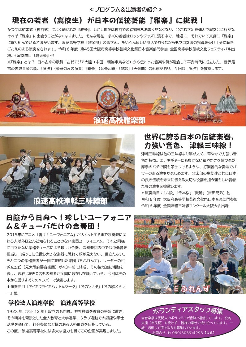 演奏:雅楽演奏=浪花高等学校雅楽部 津軽三味線合奏=浪花高等学校津軽三味線部 ユーフォニアム&チューバ合奏=Eふれんず