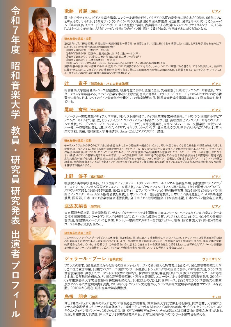 2023年に次ぐ研究発表。前回は基本楽想(第1番~第7番)を演奏したが、今回は続く6曲を演奏したい。版により番号が異なるため以下に列記。(BWVの番号はBaerenreiter版)