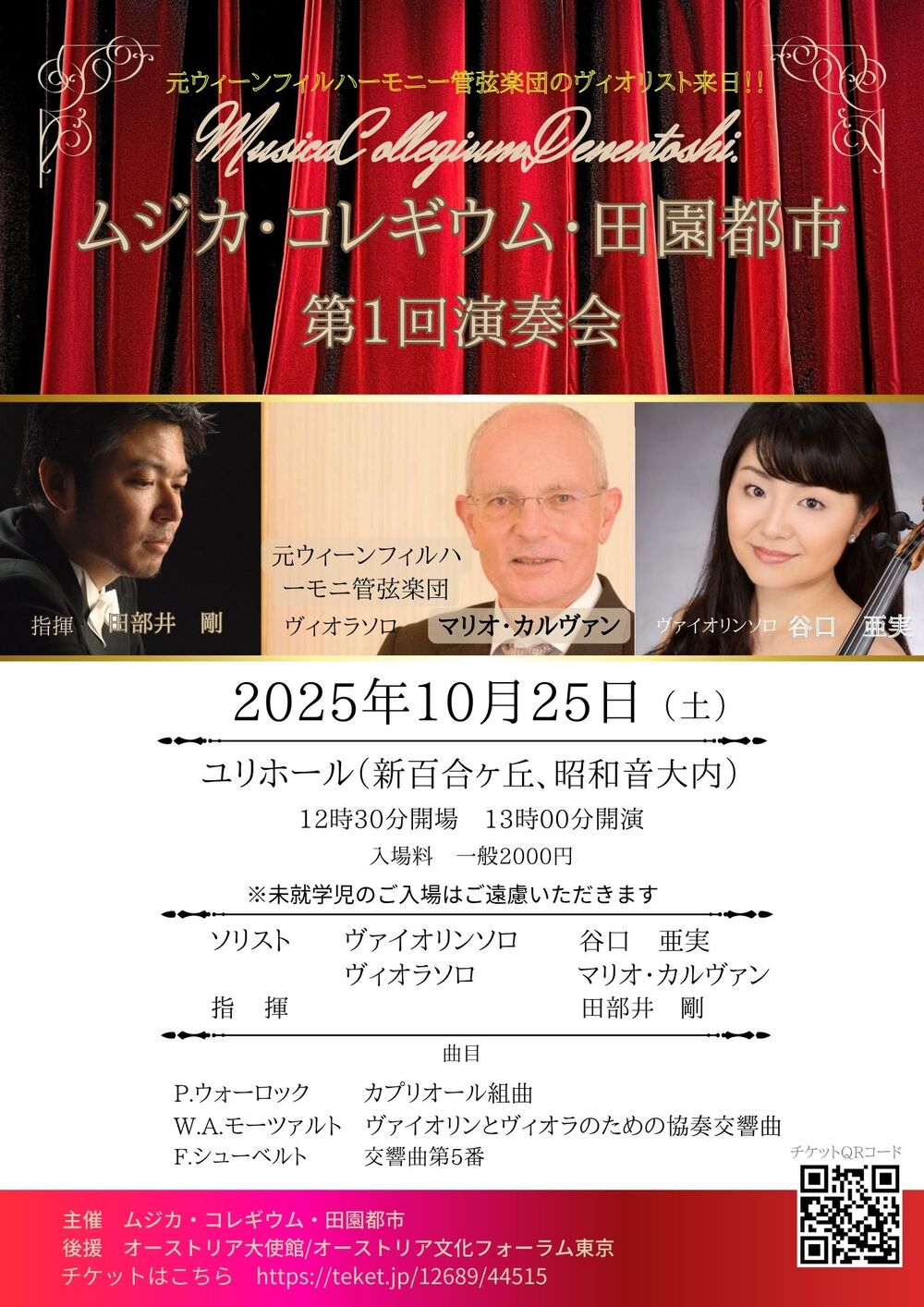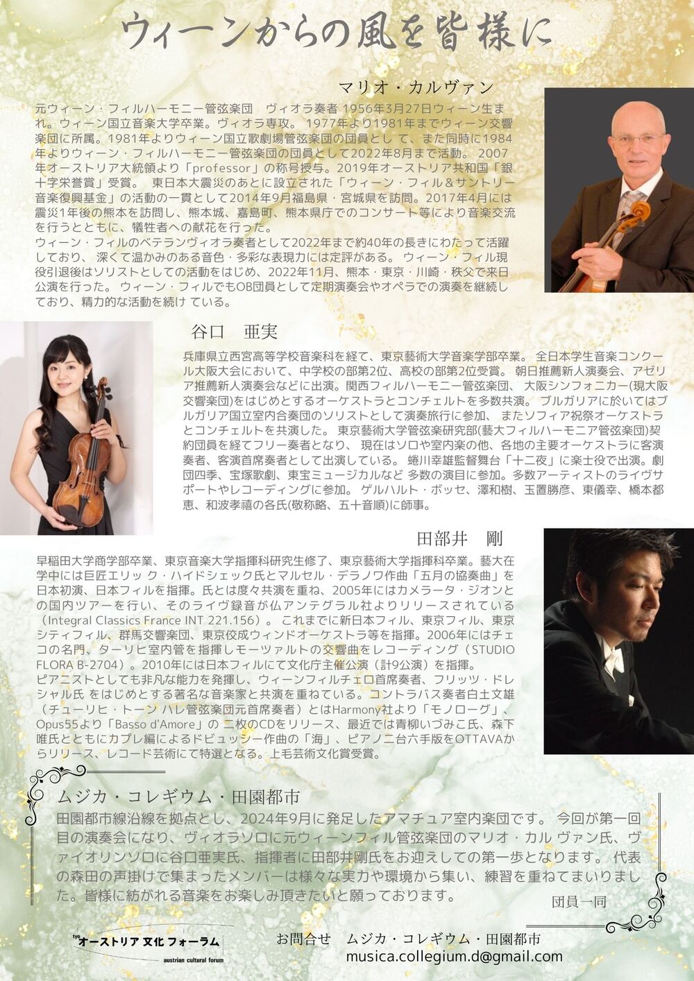 元ウィーンフィルハーモニー管弦楽団、ヴィオリストのマリオ・カルヴァン氏と、ヴァイオリニストの谷口亜実氏をお迎えして、本場ウィーンの調べをお届けします♪是非ご来場お待ちしております。