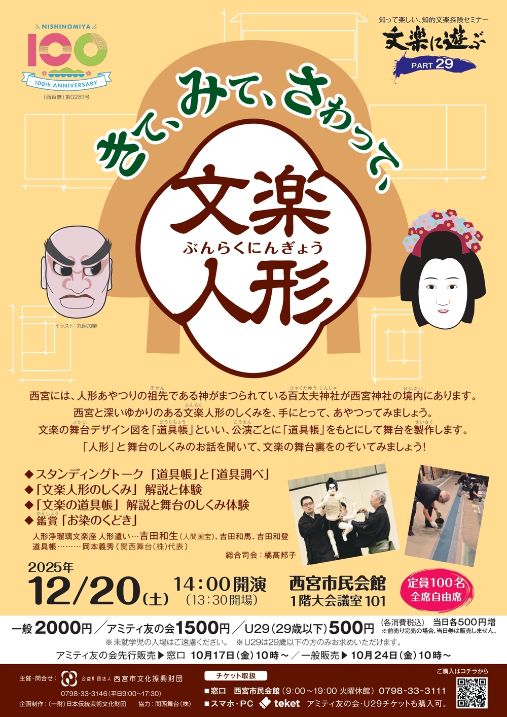 西宮と深いゆかりのある文楽人形のしくみを、手にとって、あやつってみましょう。