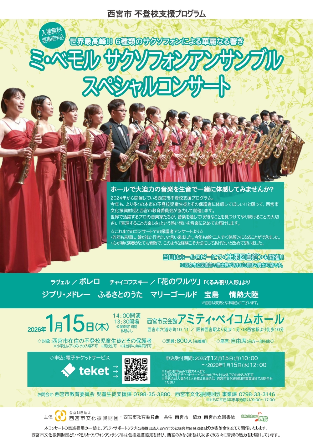 今年も、より多くの本市の不登校児童生徒とその保護者に体感してほしい!!と願って、西宮市文化振興財団と西宮市教育委員会が協力して開催します。