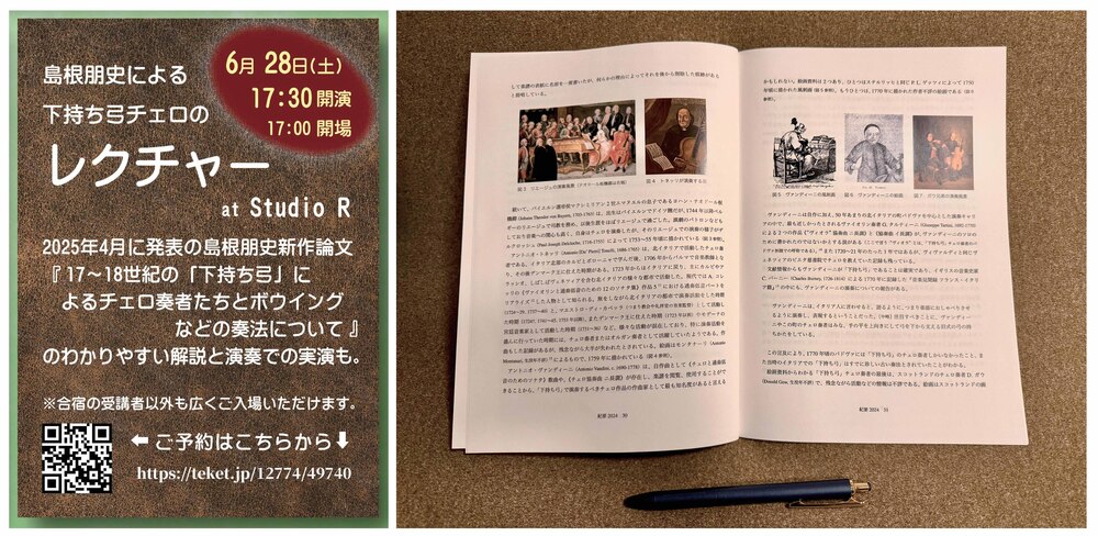 ②「レクチャー」では、今年公開となった島根朋史新作論文の「17 ~ 18 世紀の「下持ち弓」によるチェロ奏者たちとボウイングなどの奏法について」のお話しと実演のレクチャーコンサート。
