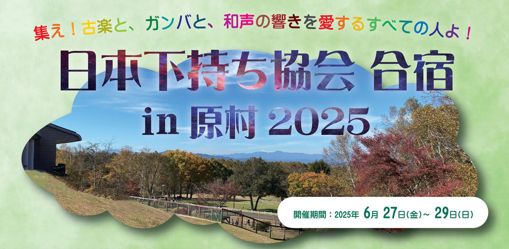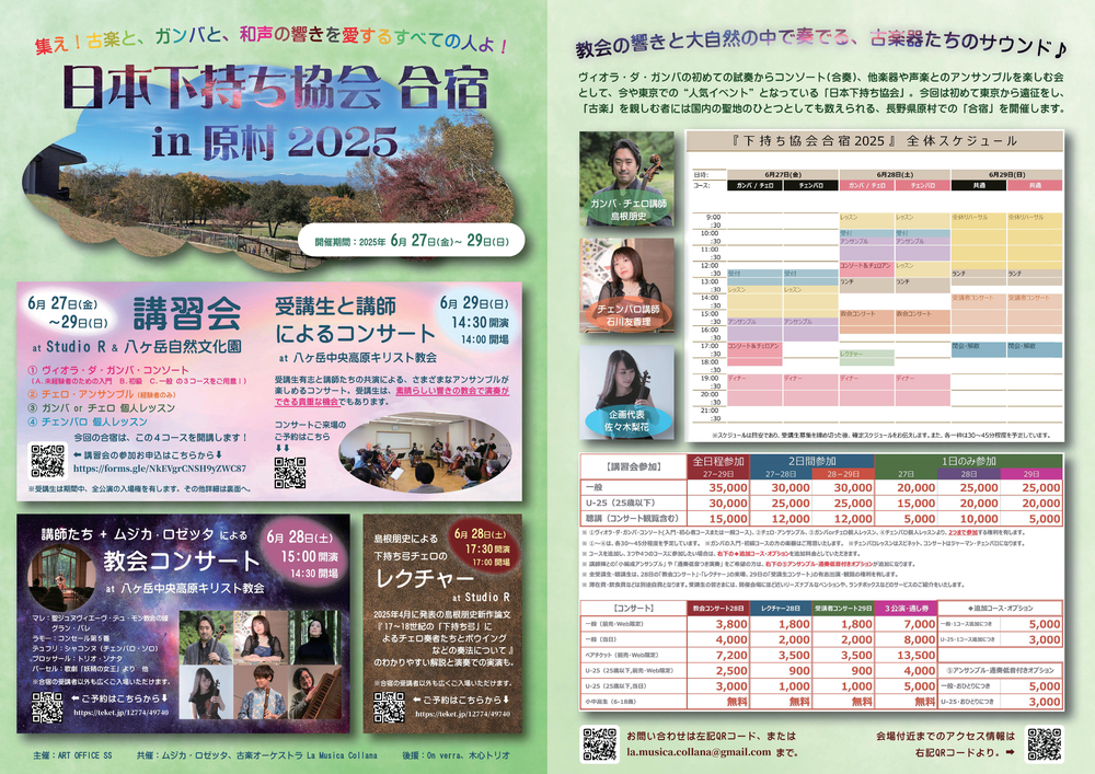 ヴィオラ・ダ・ガンバの初めての試奏からコンソート(合奏)、他楽器や声楽とのアンサンブルを楽しむ会として、今や東京での ”人気イベント” となっている「日本下持ち協会」。2025年6月には東京から遠征をし、「古楽」を親しむ者には国内の聖地のひとつとしても数えられる、長野県原村での「合宿」を開催します。