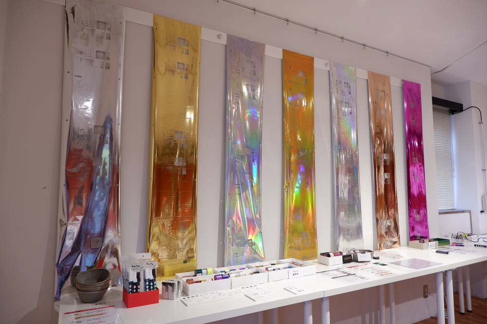 箔版や紙の見本から作品サンプル、販売商品まで幅広く展示しています。
