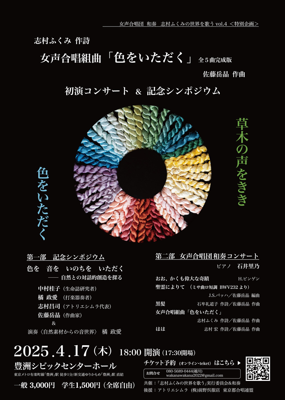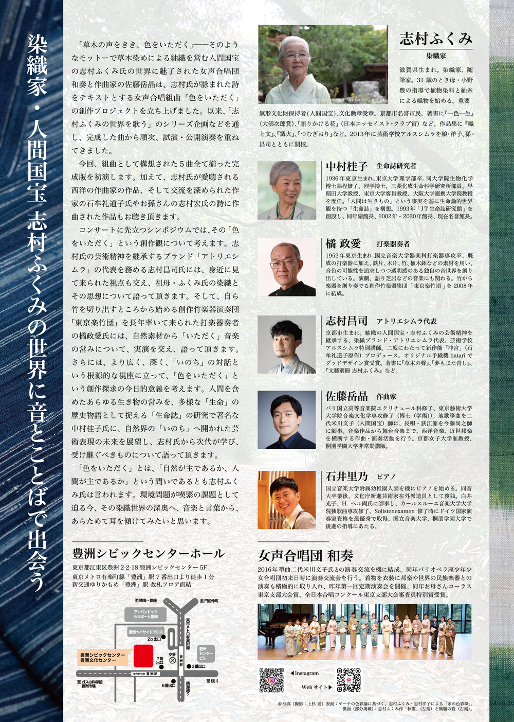「草木の声をきき、色をいただく」そのようなモットーで草木染めによる紬織を営む人間国宝の志村ふくみ氏の世界に魅了された女声合唱団 和奏と作曲家の佐藤晶は、志村氏が詠まれた詩をテキストとする女声合唱組曲「色をいただく」の創作プロジェクトを立ち上げました。以来、「志村ふくみの世界を歌う」のシリーズ企画などを通し、完成した曲から順次、試演・公開演奏を重ねてきました。