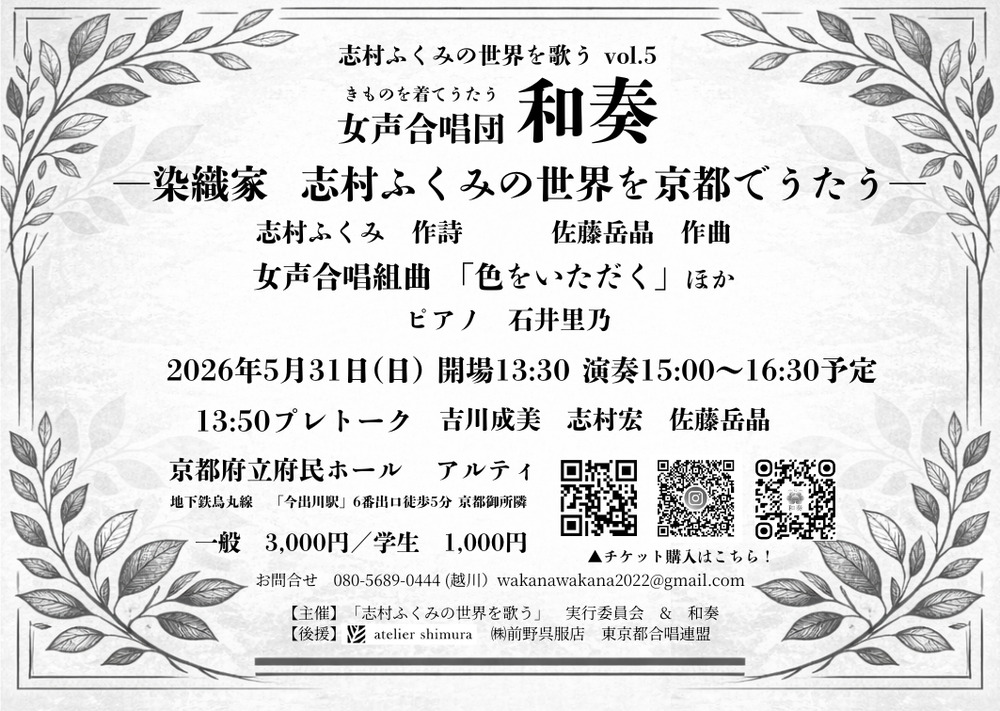 「草木の声をきき、色をいただく」そのようなモットーで草木染めによる紬織を営む人間国宝の志村ふくみ氏の世界に魅了された女声合唱団 和奏と作曲家の佐藤岳晶は、志村氏が詠まれた詩をテキストとする女声合唱組曲「色をいただく」の創作プロジェクトを立ち上げました。以来、「志村ふくみの世界を歌う」のシリーズ企画などを通し、完成した曲から順次、試演・公開演奏を重ね、2025年4月に組曲として構想された5曲全て揃った完成版を初演いたしました。