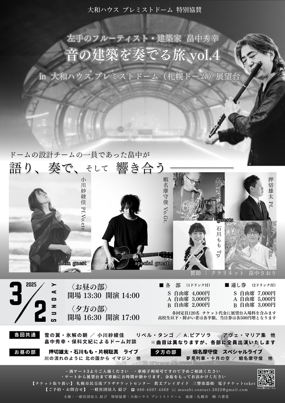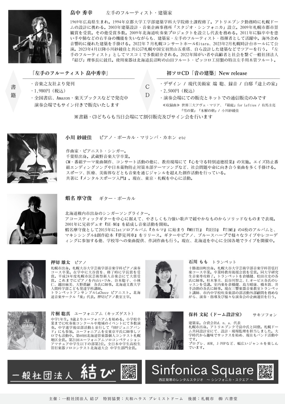 1969年広島県生まれ。1994年京都大学工学部建築学科大学院修士課程修了。アトリエブンク勤務時に札幌ドームの設計に携わる。2003年建築設計・音楽企画事務所「スタジオ・シンフォニカ」設立。2009年札幌市都市景観賞を受賞。その他受賞多数。2009年北海道吹奏楽プロジェクトを設立し代表を務める。2011年に脳卒中を患い手や肺などの右半身の機能を失いながらも、建築家・左手のフルーティスト・指揮者として活躍中。海外含め音響的に優れた建築を手掛ける。2022年7月札幌コンサートホールKitara、2023年2月札幌時計台ホールにて公演。2023年4月以降小川紗綾佳と共にG7札幌や国宝羽黒山五重塔、自ら設計した建築などでツアーを行う。「左手のフルーティスト」としてマスコミで多数紹介される。2022年障がい者や高齢者と社会を繋ぐ一般社団法人「結び」理事長に就任。使用楽器は北海道長沼町の山田フルート・ピッコロ工房製の特注左手用木管フルート。