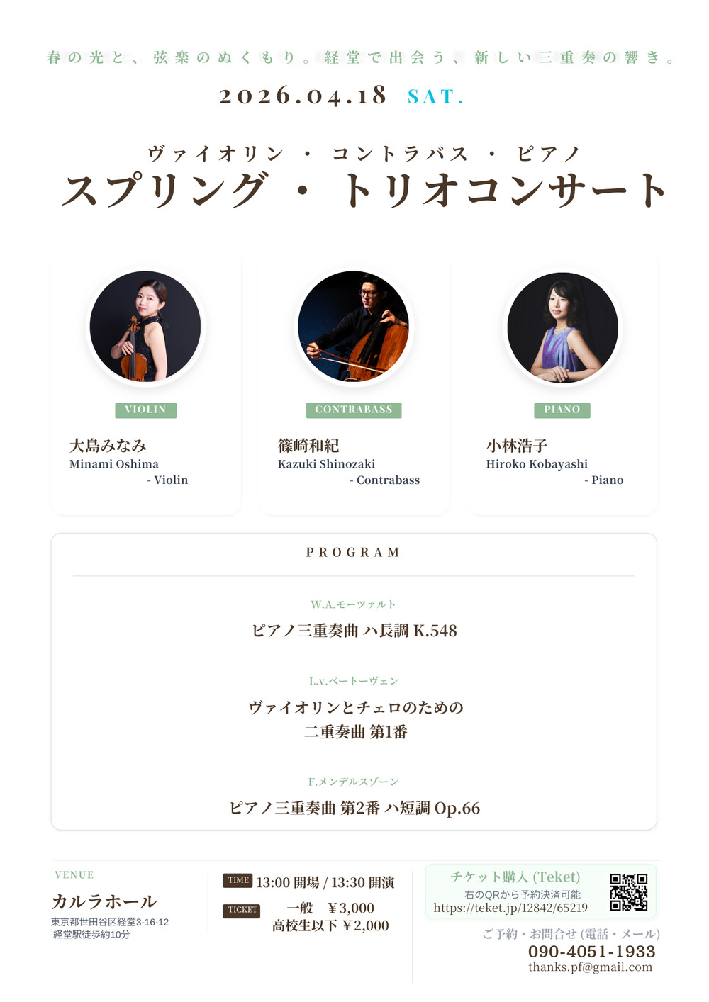 モーツァルトからメンデルスゾーンまで、デュオやトリオでの室内楽を演奏いたします。滅多に聞けない『ヴァイオリン×コントラバス×ピアノ』の響きをお楽しみください。