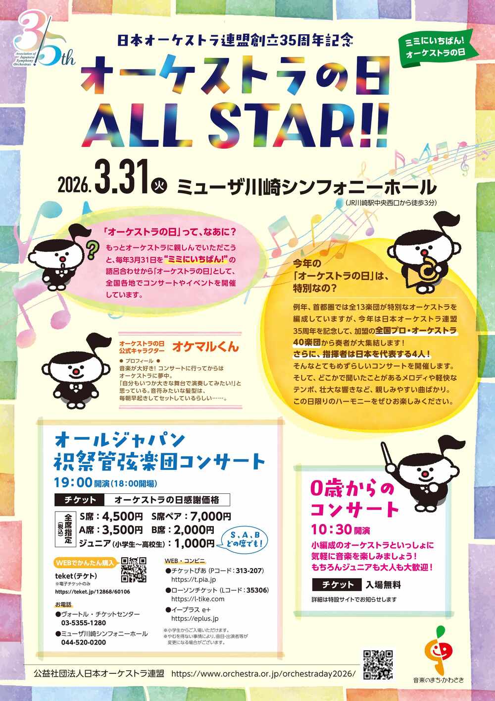 皆様に支えられ日本オーケストラ連盟創立35周年を迎えました本年は、より特別な「オーケストラの日」をお届けします。題して、「オーケストラの日 ALL STAR!!」。