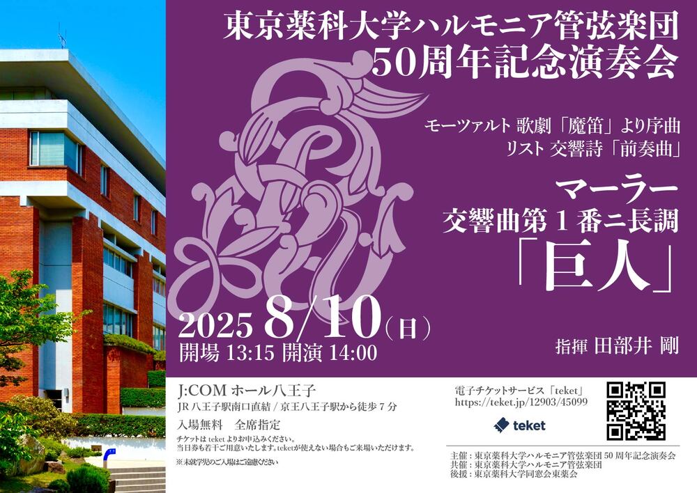 東京薬科大学八王子キャンパスと共に歩んできたハルモニア管弦楽団は今年創立50周年を迎えます。これを記念して8月に演奏会を開催することになりました。黎明期〜現役学生まで幅広い世代のメンバーが集まり、一致団結し演奏会の成功にむけて準備を進めています。皆様のご来場を心よりお待ちしております。