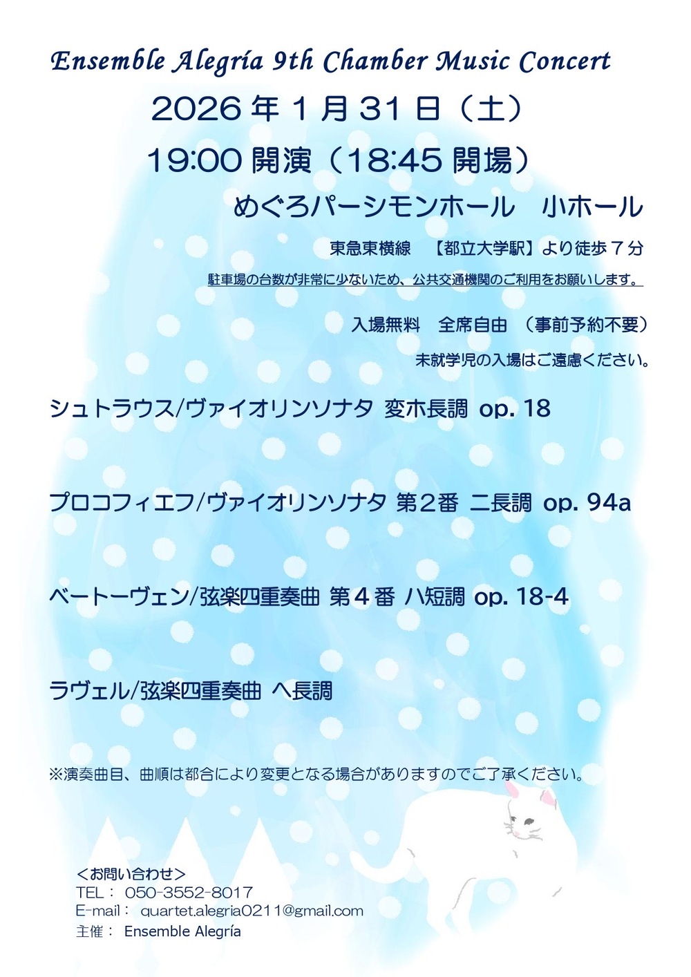 東京都目黒区で活動するアマチュアの室内楽アンサンブルグループです。めぐろパーシモンホールの小ホールや、中目黒GTプラザホールで入場無料の演奏会を定期的に開催しています。