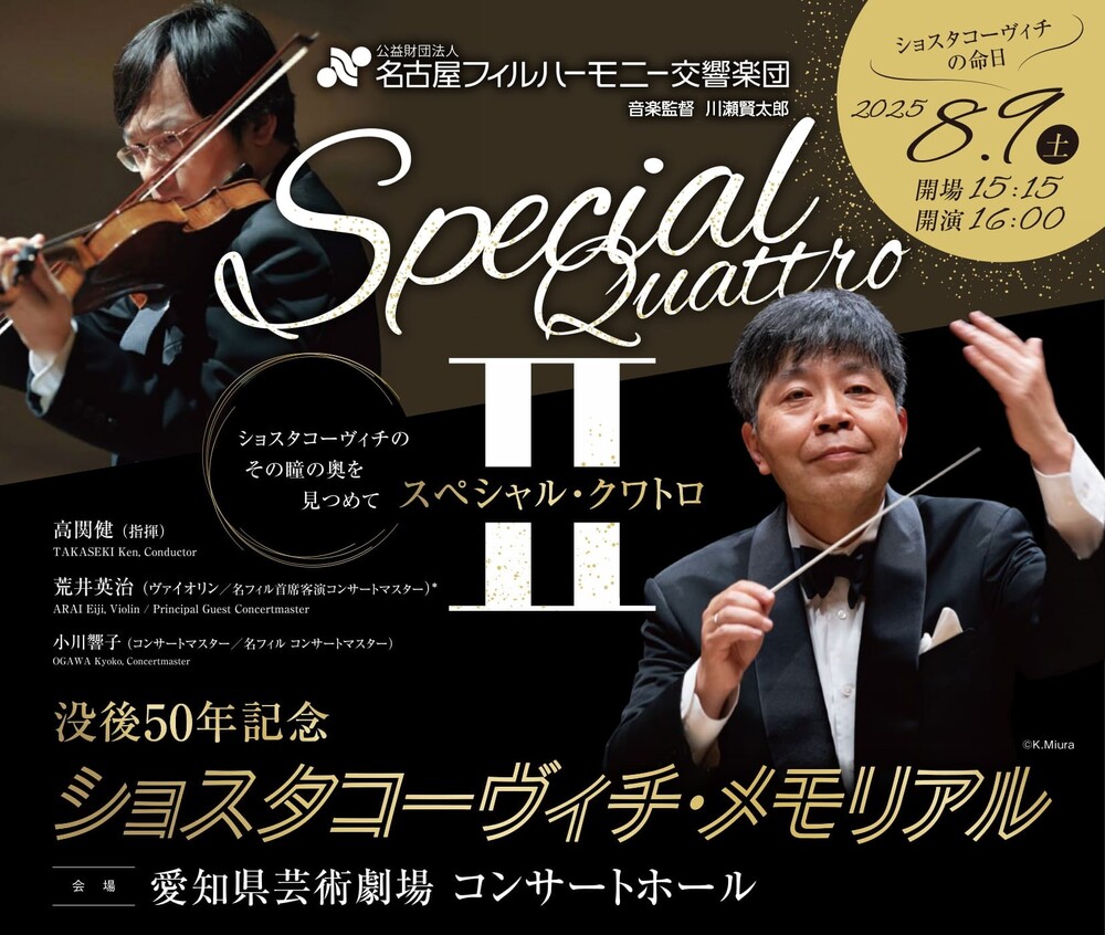 8月9日はショスタコーヴィチの命日です。その日に彼と同じ年齢、68歳でステージに立つのは、名フィル首席客演コンサートマスターの荒井英治。1日で2曲の大協奏曲に挑むというスペシャルな公演が実現します。間に挟まれたシチェドリン作品も荒井英治のチョイスです。
