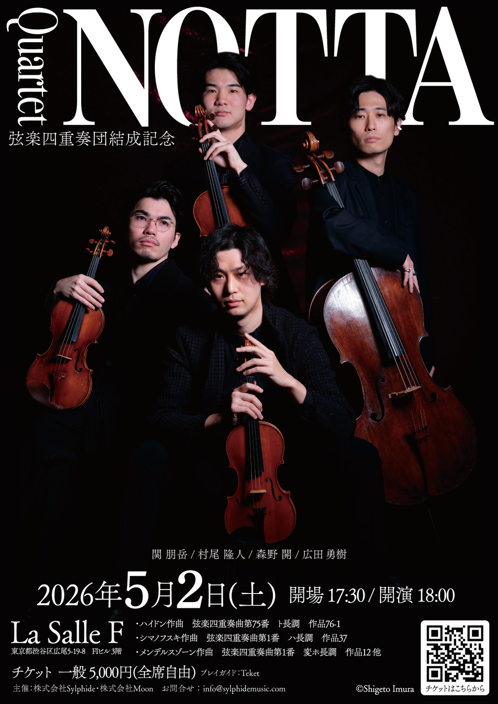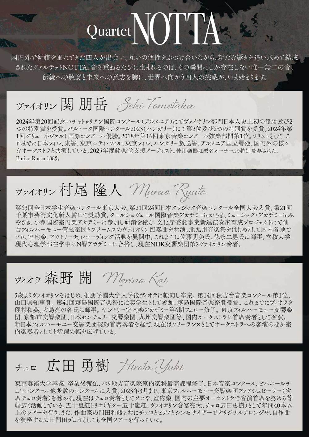 クァルテットNOTTA。音を重ねるたびに生まれるのは、その瞬間にしか存在しない唯一無二の音。伝統への敬意と未来への意志を胸に、世界へ向かう四人の挑戦が、いま始まります。