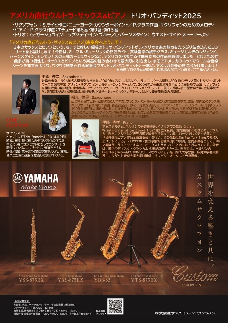 2本のサックスとピアノという、ちょっと珍しい編成のトリオ・バンディットが、アメリカ音楽の魅力をたっぷり詰め込んだコンサートをお届けします!今回は、ミニマル・ミュージックの巨匠ライヒ、実験音楽の旗手グラス、ミュージカル界のレジェンド、バーンスタイン、そしてジャズの王様ガーシュウィンなど、アメリカを代表する作曲家たちの作品を厳選しました。それぞれの作曲家が持つ個性を、サックスとピアノという楽器の組み合わせで最大限に引き出し、まるでアメリカのホットでクールな音楽シーンを旅するような、ワクワク感あふれる演奏会です。トリオ・バンディットと一緒に、アメリカ音楽の旅に出かけましょう! *当日プログラムが変更される場合がございます。ご了承ください。