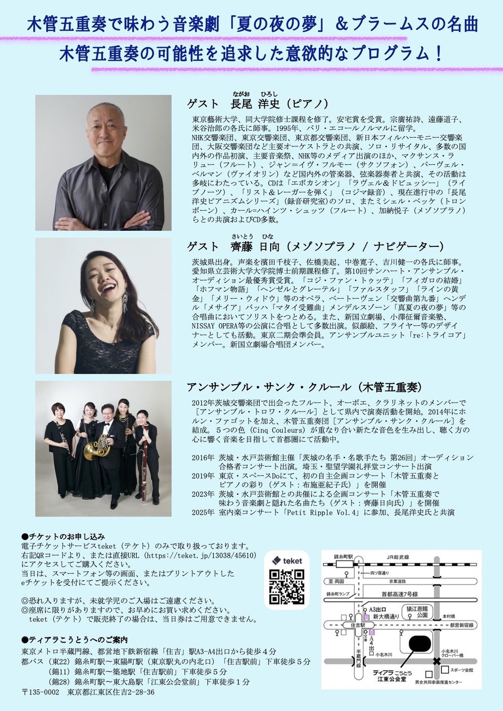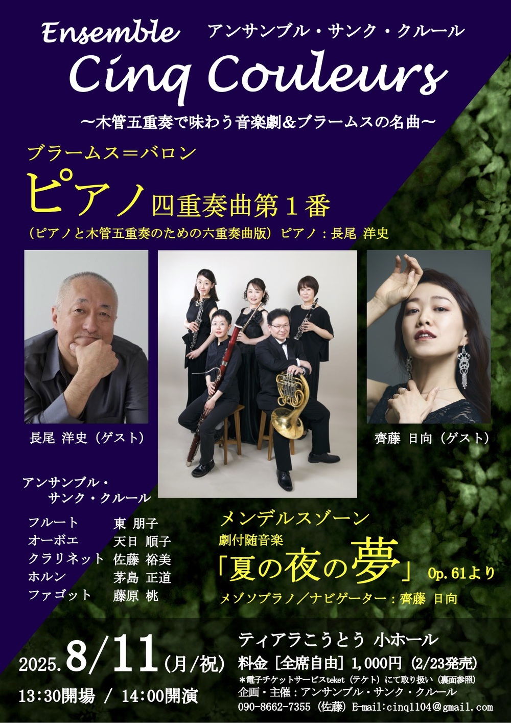 アンサンブル・サンク・クルールは2014年に結成した木管五重奏団で、2016年茨城・水戸芸術館主催「茨城の名手・名歌手たち 第26回」オーディション合格者コンサート出演、その後2019年、2023年に東京・茨城にて自主企画コンサートを開催しています。今回3回めとなる自主企画コンサートはピアニスト長尾洋史氏を迎え、ブラームスの名曲ピアノ四重奏曲第1番をピアノと木管五重奏による六重奏曲版で演奏いたします。また後半は、2023年のコンサートで好評を博した齊藤日向氏によるお話と歌付きの音楽劇、メンデルスゾーン「夏の夜の夢」(サンク・クルールオリジナルバージョン)を再演いたします。木管五重奏の可能性を追求した意欲的なプログラムをぜひお楽しみください。
