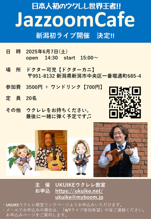 日本人初ウクレレ世界王者! 新潟初ライブ決定!! 先着20名!!!