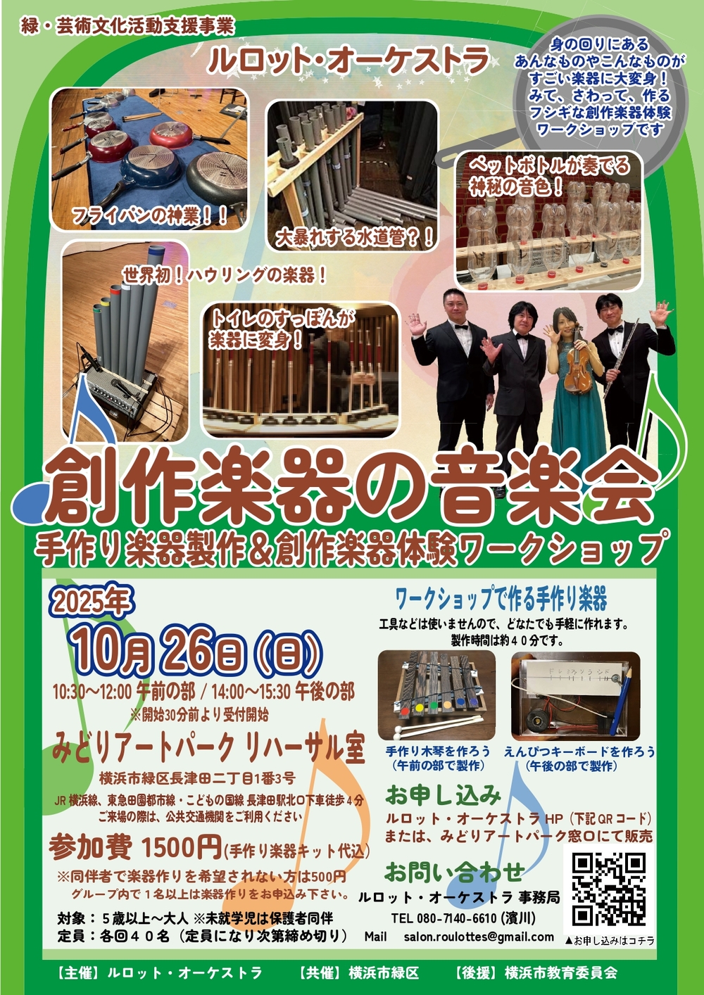 今回は、手作りだけど本格的な木琴製作(午前公演)と、えんぴつでドレミが弾ける「えんぴつキーボード」製作(午後公演)を中心に、当団秘蔵の日用品楽器を実際にさわることができる、体験型ワークショップコンサートです。