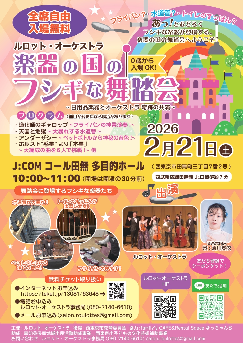 楽器と音楽の国「ルロット王国」に伝わる、フライパン、水道管、トイレのすっぽんなどのフシギな伝説の楽器たちが、オーケストラと奇跡の共演を繰り広げる、笑いと驚きを詰め込んだナレーション付き公演です。