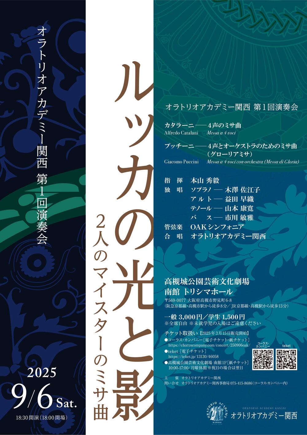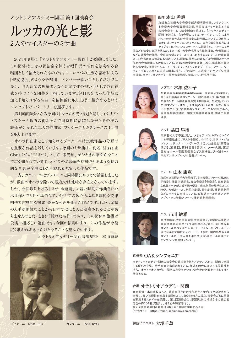 2024年9月に「オラトリオアカデミー関西」が始動しました。この団体は古今の管弦楽を伴う合唱作品の名作を演奏する合唱団として結成されたものです。ヨーロッパの主要な都市にある「楽友協会」のような合唱団、メンバーが歌い手としてだけではなく、良き音楽の理解者となり音楽文化の担い手としての存在感を持つような団体を目指しています。 評価の定まった作品に加え「知られざる名曲」を積極的に取り上げ、紹介するというコンセプトでレパートリーを選びます。