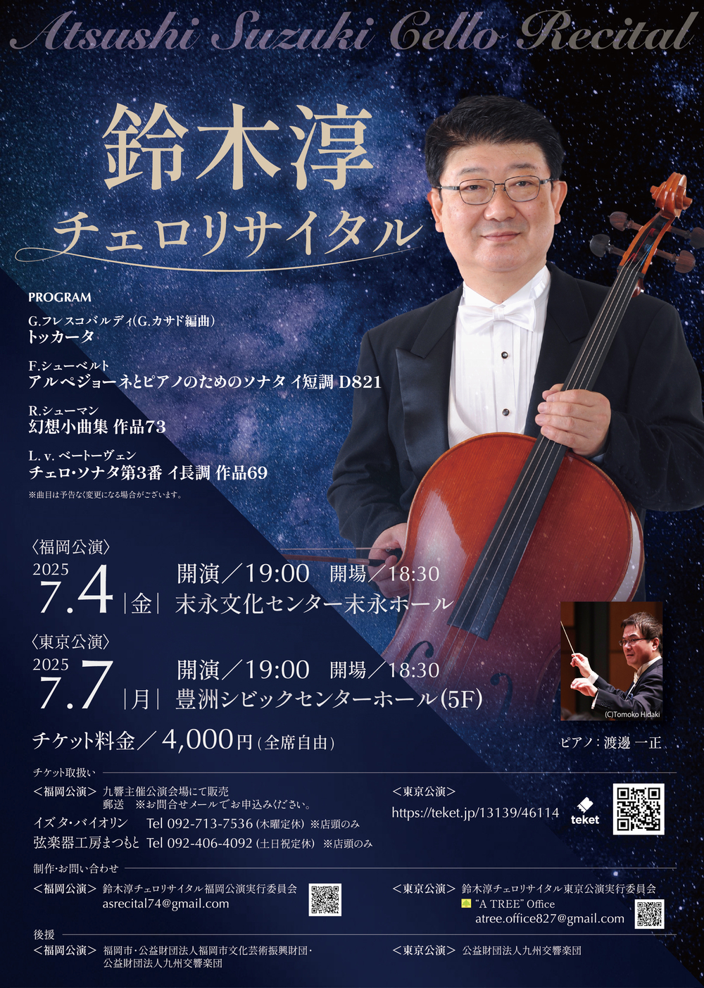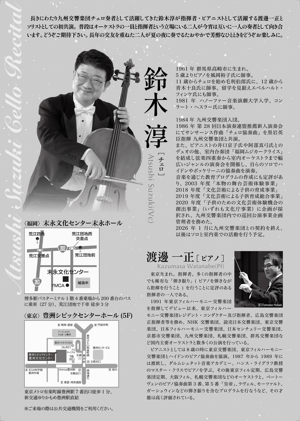 長きにわたり九州交響楽団チェロ奏者として活躍してきた鈴木淳が指揮者・ピアニストとして活躍する渡邊一正とソリストとしての初共演。