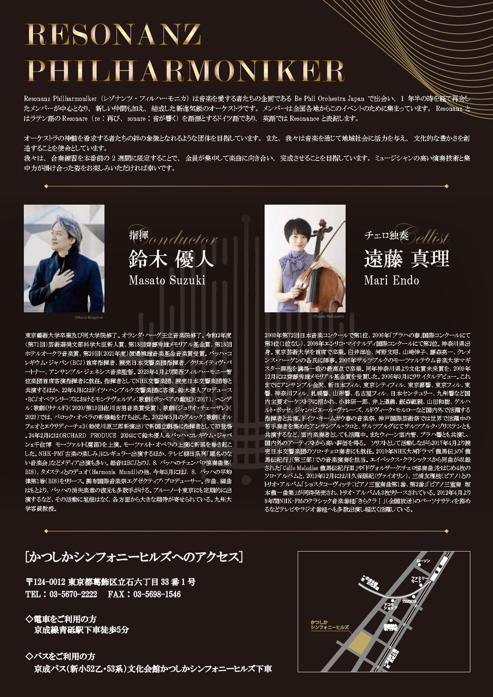 Resonanz Philharmoniker(レゾナンツ・フィルハーモニカ)は音楽を愛する者たちの企画であるBe Phil Orchestra Japanで出会い、1年半の時を経て再会したメンバーが中心となり、新しい仲間も加え、結成した新進気鋭のオーケストラです。メンバーは全国各地からこのイベントのために集まっています。Resonanzとはラテン語のResonare(re:再び、sonare:音が響く)を語源とするドイツ語であり、英語ではResonance と表記します。
