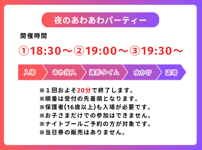 さらに同時開催の「夜のあわあわパーティー」では、全身泡まみれになるワクワク体験が待っています。