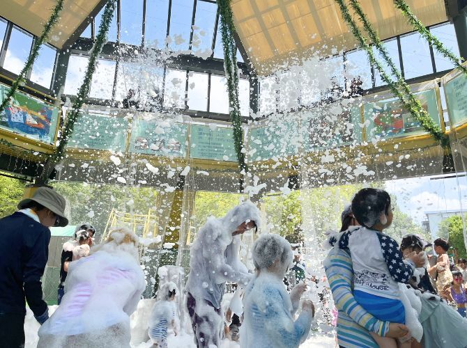 もこもこの泡が上空から一気に降り注ぐ“泡キャノン”は、子どもも大人も夢中になれるわくわく体験。