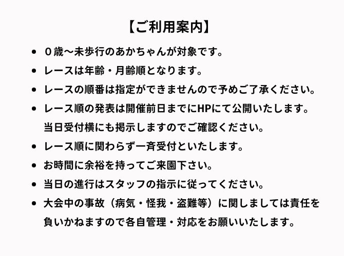 レースは年齢・月齢順となります。レースの順番は指定ができませんので予めご了承ください。