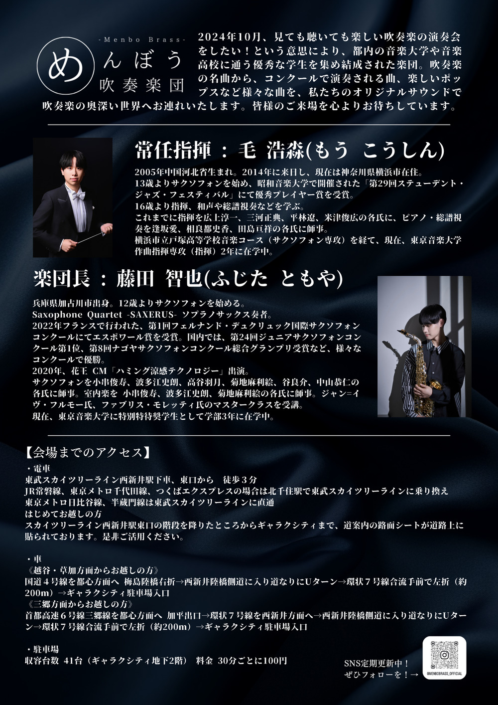 第一部では、吹奏楽好きにはたまらない曲を用意し、めんぼうブラスならではのフレッシュサウンドで名曲をお届けいたします。