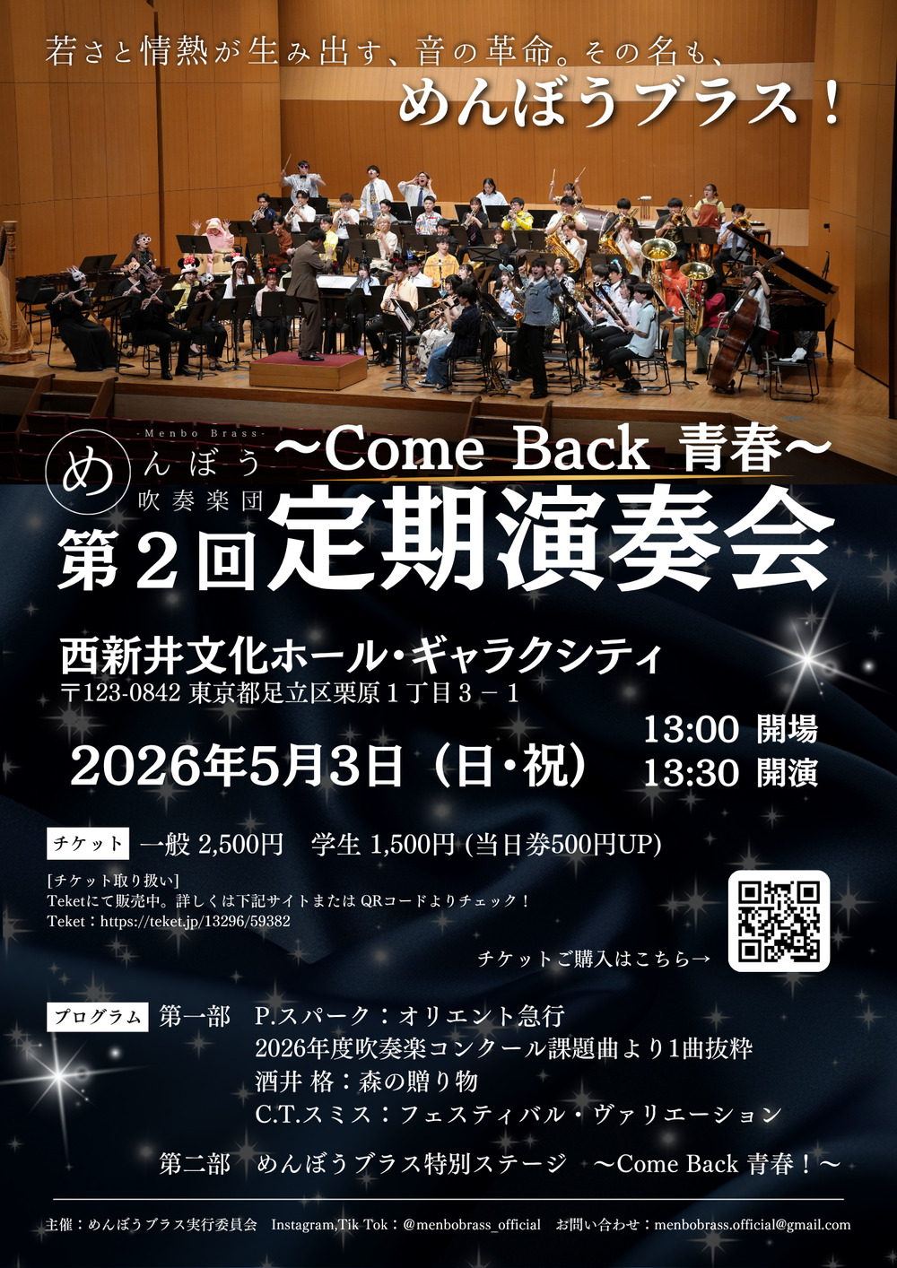 めんぼうブラス待望の第2回定期演奏会!今年は〜Come Back 青春〜 と題して、老若男女みんな青春を感じよう!というコンセプトでお届けいたします。