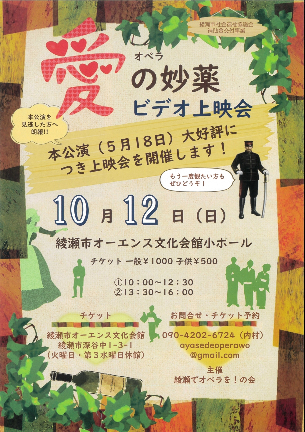 本年5月18日に綾瀬市オーエンス文化会館で上演された「愛の妙薬」が大変好評だったためのビデオ上映 見逃した方、ご覧になられた方でもう一度ご覧になりたい方是非おちついてお楽しみください。