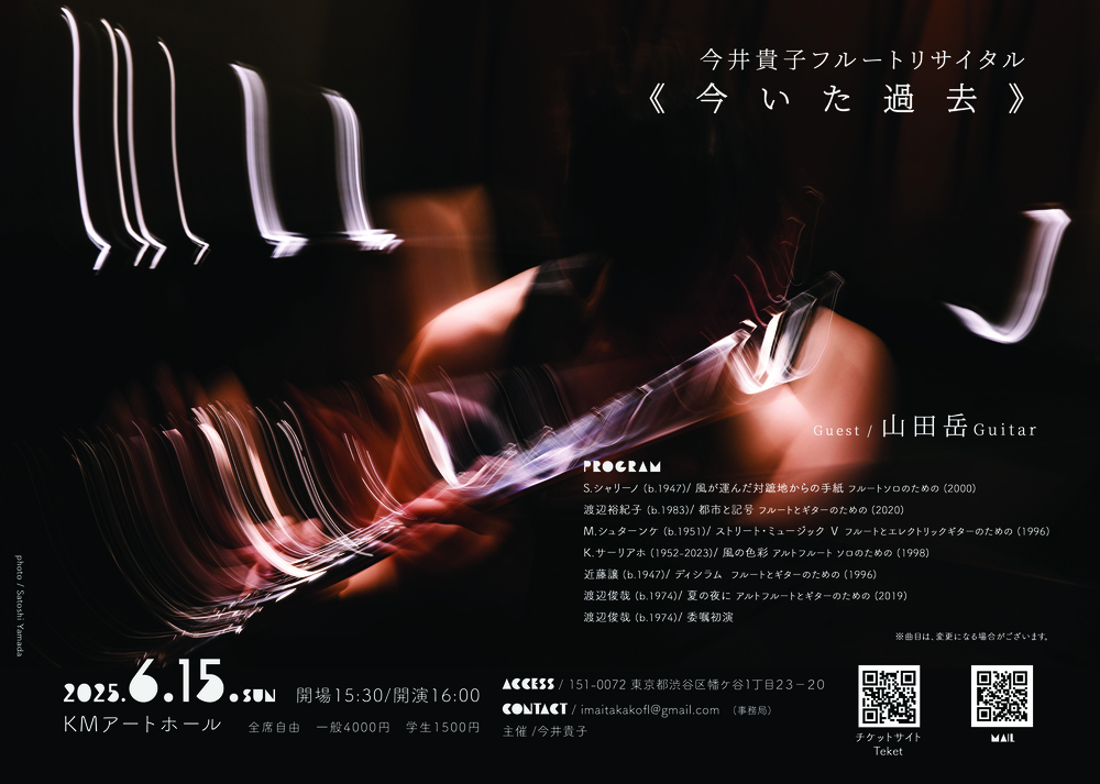 共演には、現代ギター界を代表する山田岳氏をお迎えし、新しいフルートとギターのレパートリーを開拓していきます。そして、フルートの独奏作品では、まるで音楽で哲学を表したような作品が印象的な渡辺俊哉氏の新作委嘱もあり、シャリーノとサーリアホとの対比もお楽しみいただけたら幸いです。