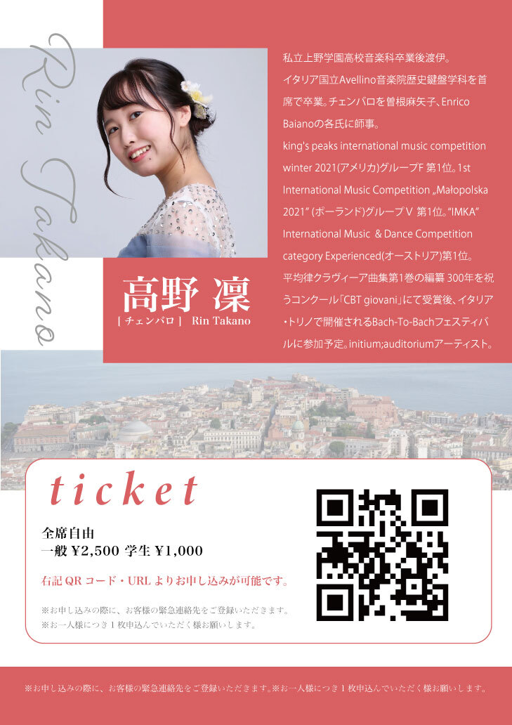 2000年東京都生まれ。6歳よりチェンバロを始める。 イタリア国立Avellino音楽院歴史鍵盤学科を首席で卒業。 チェンバロを曽根麻矢子、Enrico Baianoの各氏に師事。 king's peaks international music competition winter 2021(アメリカ)グループF 第1位。 1st International Music Competition „Małopolska 2021” (ポーランド)グループⅤ 第1位。 “IMKA” International Music & Dance Competition category Experienced(オーストリア)第1位。 平均律クラヴィーア曲集第1巻の編纂 300年を祝うコンクール「CBT giovani」にて受賞後、2022年11月イタリア・トリノで開催されるBach-To-Bachフェスティバルに参加予定。