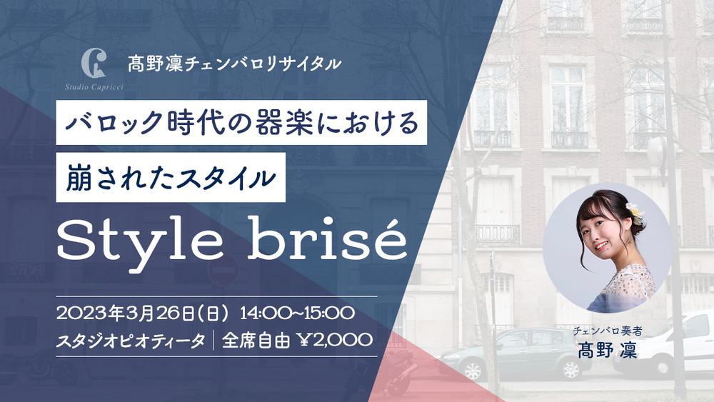 Style Brisèをテーマに、prélude non mesuréを含むフランスの作曲家による組曲を複数曲演奏予定の60分プログラム。