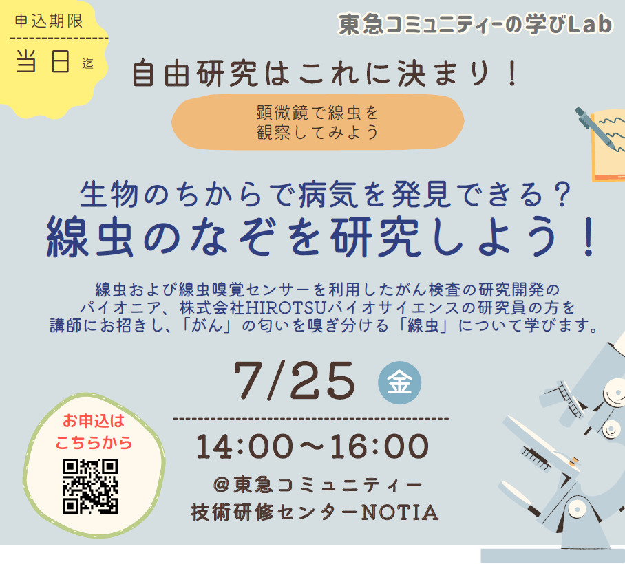線虫および線虫嗅覚センサーを利用したがん検査の研究開発のパイオニア、株式会社HIROTSUバイオサイエンス(東急コミュニティー提携会社)の研究員の方を講師にお招きし、「がん」の匂いを嗅ぎ分ける「線虫」について学びます。