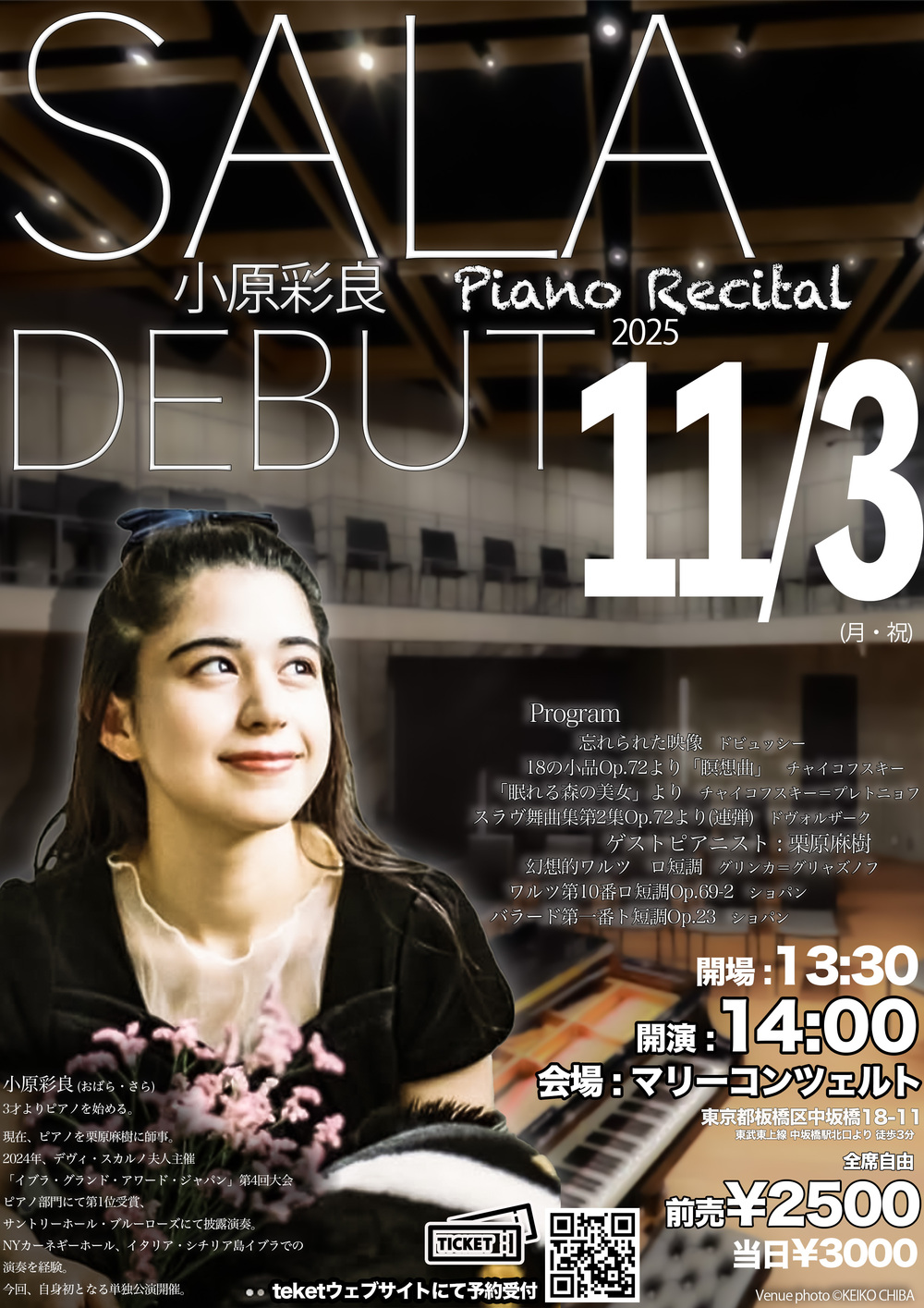 現在、クラシックピアノを、ピアニスト栗原麻樹に師事。2024年には、デヴィ・スカルノ夫人主催「イブラ・グランド・アワード・ジャパン」第4回大会ピアノ部門にて第1位を受賞し、サントリーホール・ブルーローズにて披露演奏を行う。さらに、副賞として2025年5月にニューヨーク・カーネギーホールにて、7月にイタリア・シチリア島イブラでの演奏機会を授かる。