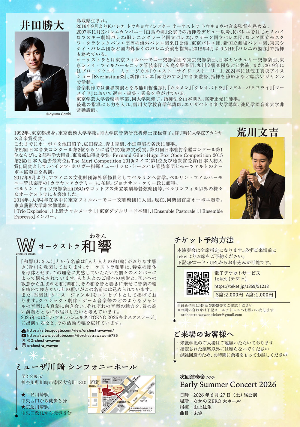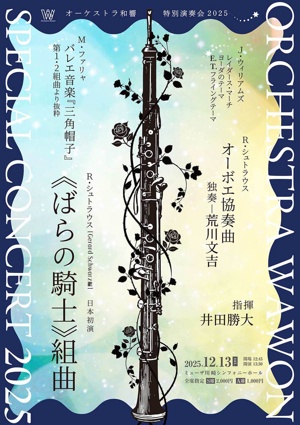 オーケストラ和響が贈る特別演奏会2025。指揮に井田勝大先生をお迎えし、東京フィルハーモニー交響楽団首席オーボエ奏者の荒川文吉先生を独奏に迎えたR.シュトラウスのオーボエ協奏曲をはじめ、ジョン・ウィリアムズの名曲たち、ファリャのバレエ音楽『三角帽子』より第1・第2組曲の抜粋、日本初演の『ばらの騎士』組曲(Gerard Schwarz編)をプログラムに据え、親しみ深く彩り豊かな演奏会お届けいたします。