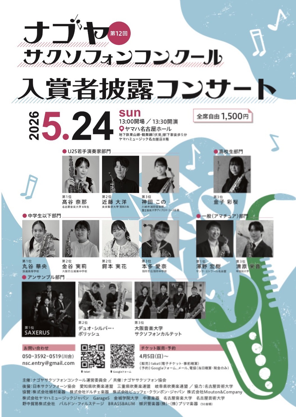 毎年2月に名古屋で「ナゴヤサクソフォンコンクール」を開催しております。 teketでは主に例年5月に開催する「入賞者披露コンサート」のチケット販売を致します。 ぜひ素晴らしい受賞者の皆様の熱演をお聴きください!